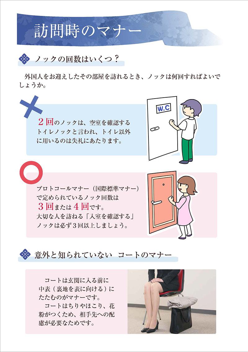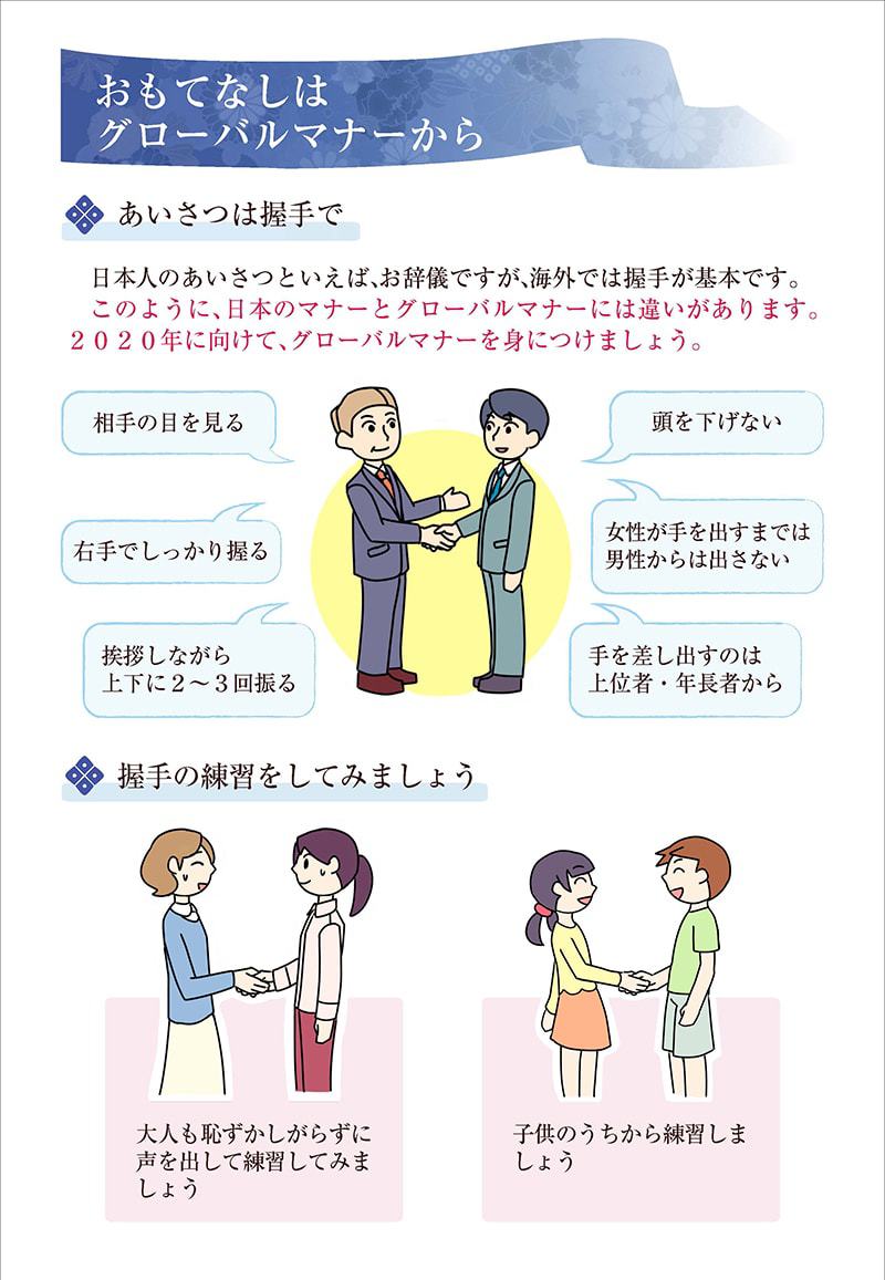 東京都教育委員会発行「オリンピック・パラリンピック教育推進のための教育支援プログラム集」のP76に「グローバルマナーとおもてなしの心」講座が紹介されています。都内各校からの申し込みは、プログラム集内に記載されている申し込み方法で、東京都以外の道府県の各校はizumiegami@outlook.jpに直接ご連絡ください。