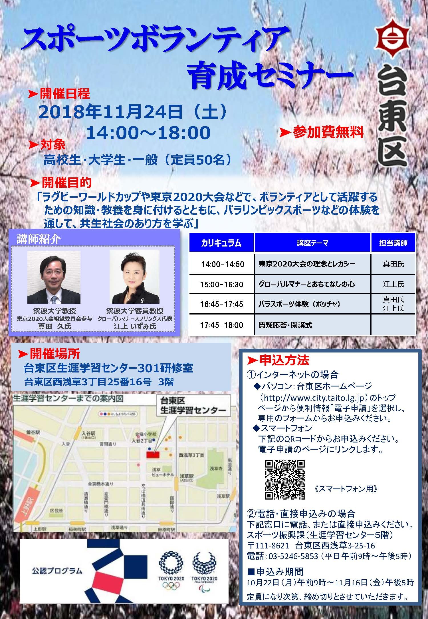 11月24日に台東区のスポーツボランティア育成セミナーを開催します。参加費無料、先着50名ですので、是非ご登録ください。