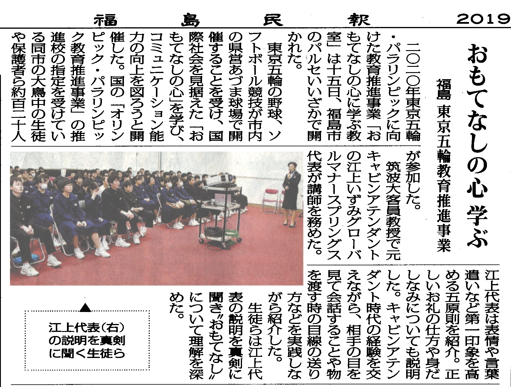 福島市立大鳥中学校での講演の様子が、1月17日(木)の福島民友で照会されました。