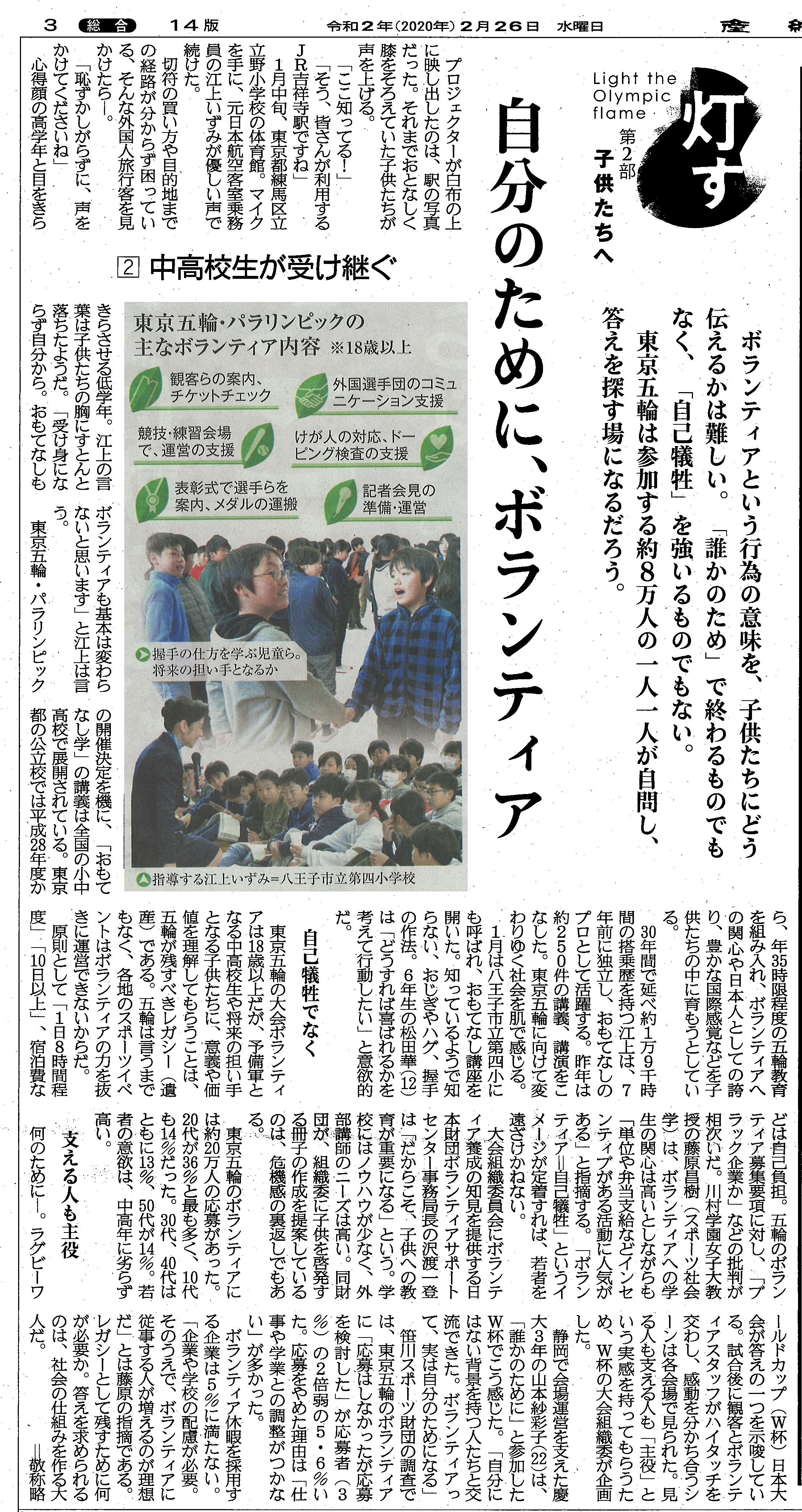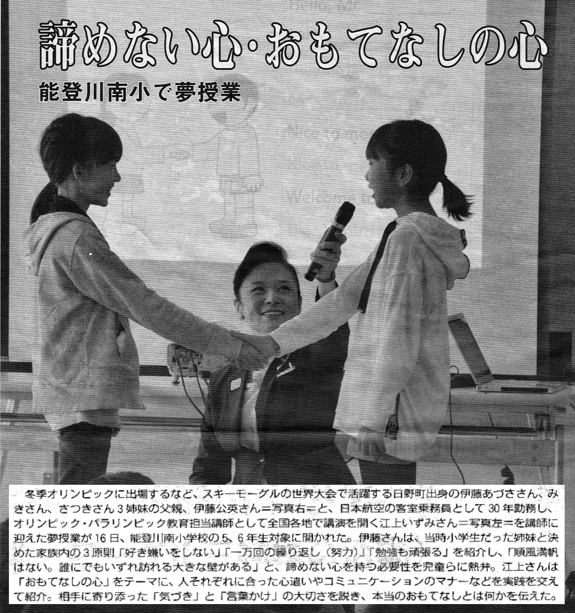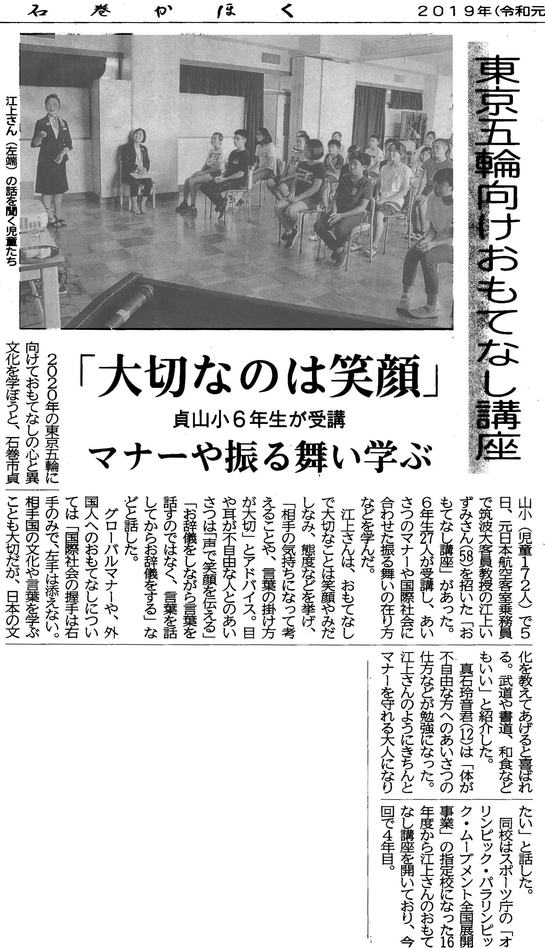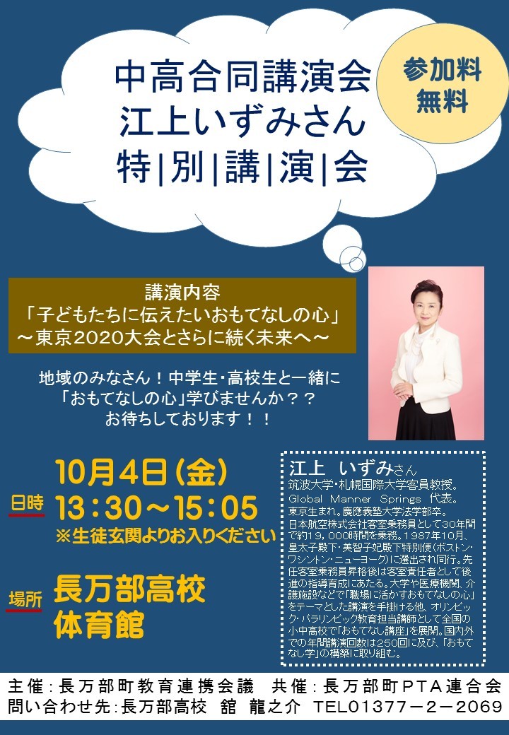 2019年10月4日(金)北海道長万部町の長万部中学校・高等学校の生徒・PTAを対象に「子ども達に伝えたいおもてなしの心」~東京2020大会とさらに続く未来へ~をタイトルに講演しました。長万部高校の学校だより11月号にその様子が掲載されました。