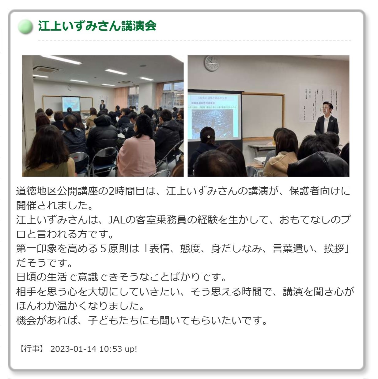 ー道徳授業地区公開講座における保護者向けの講演。多くの保護者の方々が涙を流しながら聴いてくださいました。ー