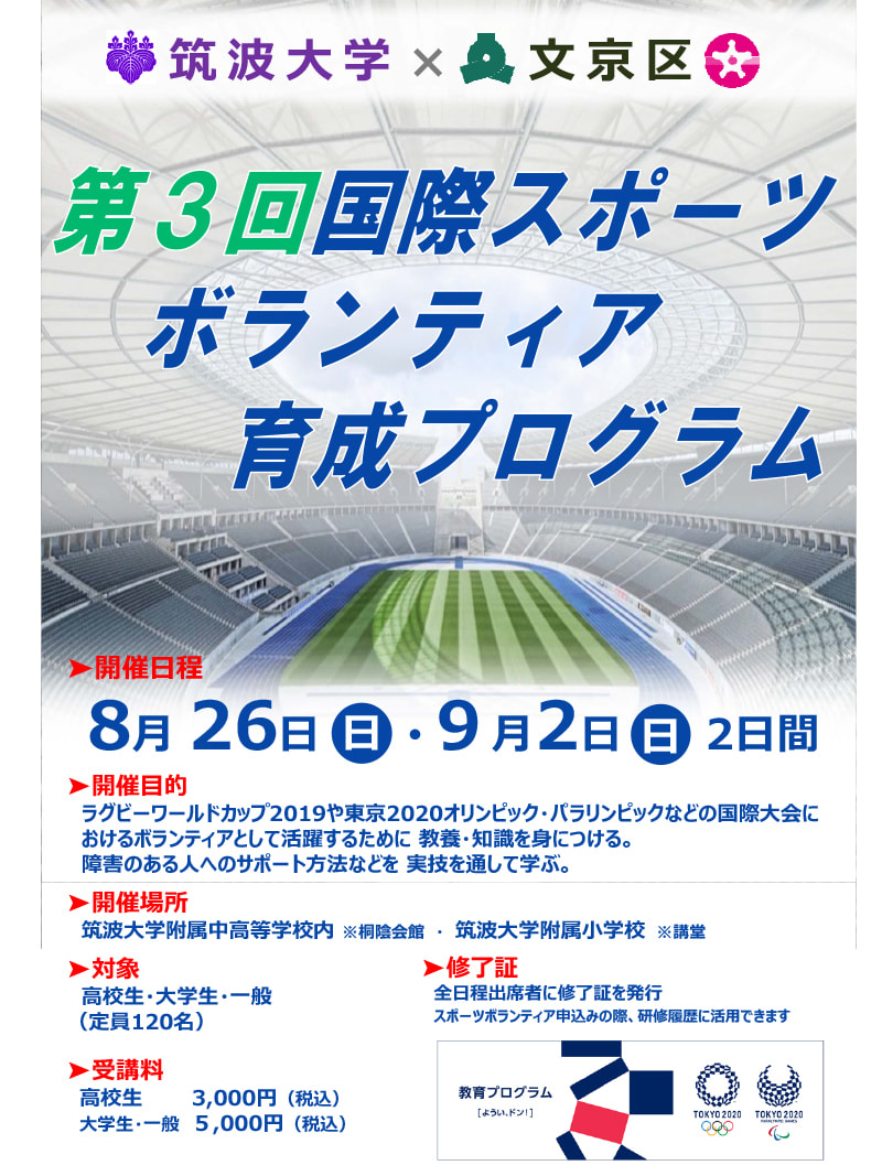 第3回国際スポーツボランティア育成プログラムを8月26日(日)9月2日(日)に開催いたします。2020年に向けてぜひ多くの皆様に受講していただきたいと思います。