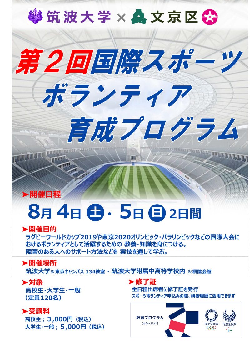 第2回国際スポーツボランティア育成プログラムを8月4日(土)5日(日)に開催いたします。9月から応募受付が始まる東京2020大会ボランティアに興味がある方はぜひお越しください。