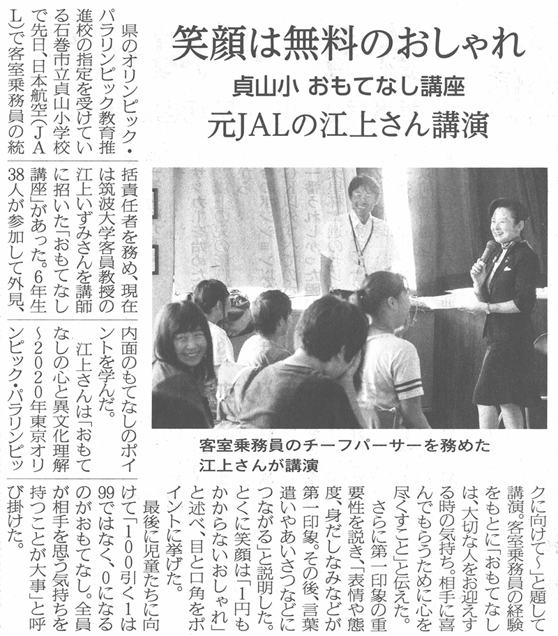 8月2日(木)宮城県石巻市立貞山小学校での講演の模様が石巻日日新聞に掲載されました。