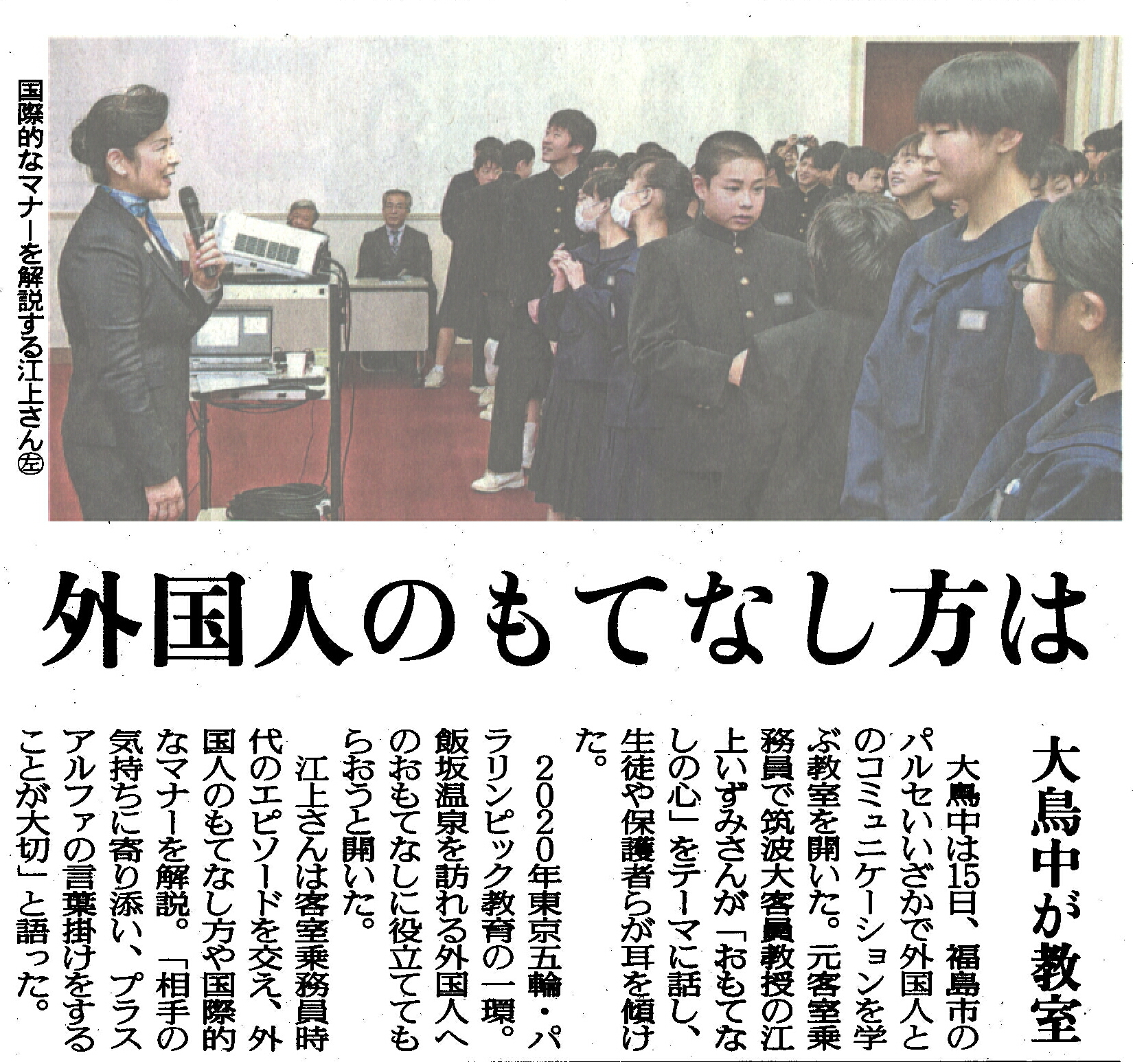福島市立大鳥中学校での講演の様子が、1月17日(木)の福島民友で照会されました。