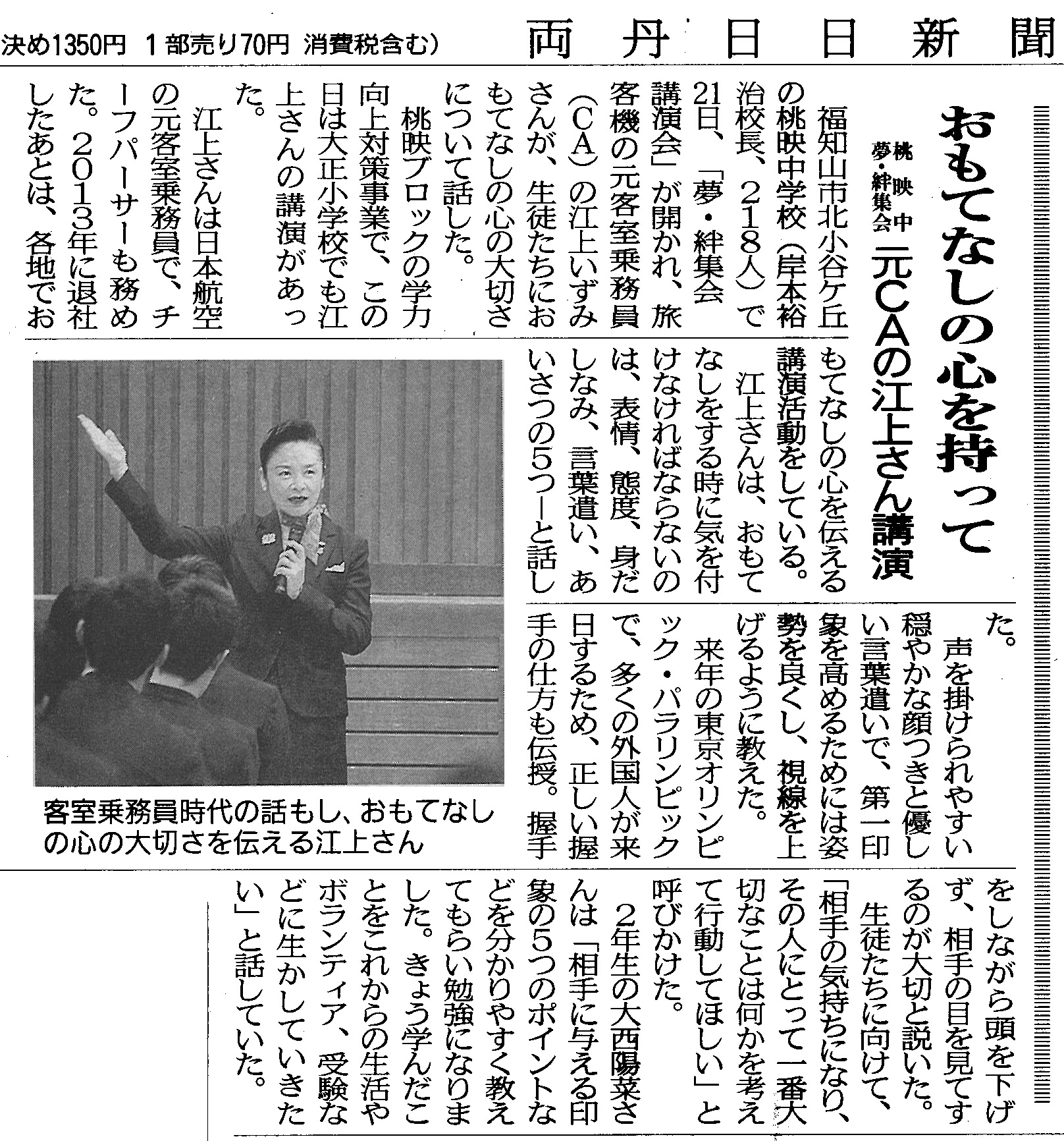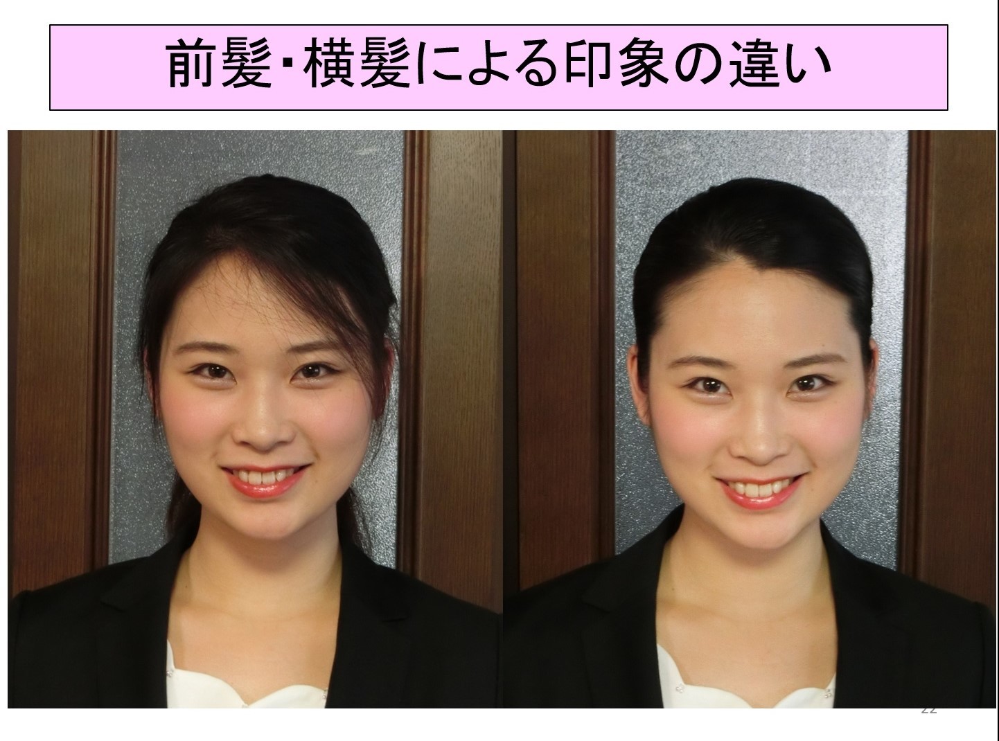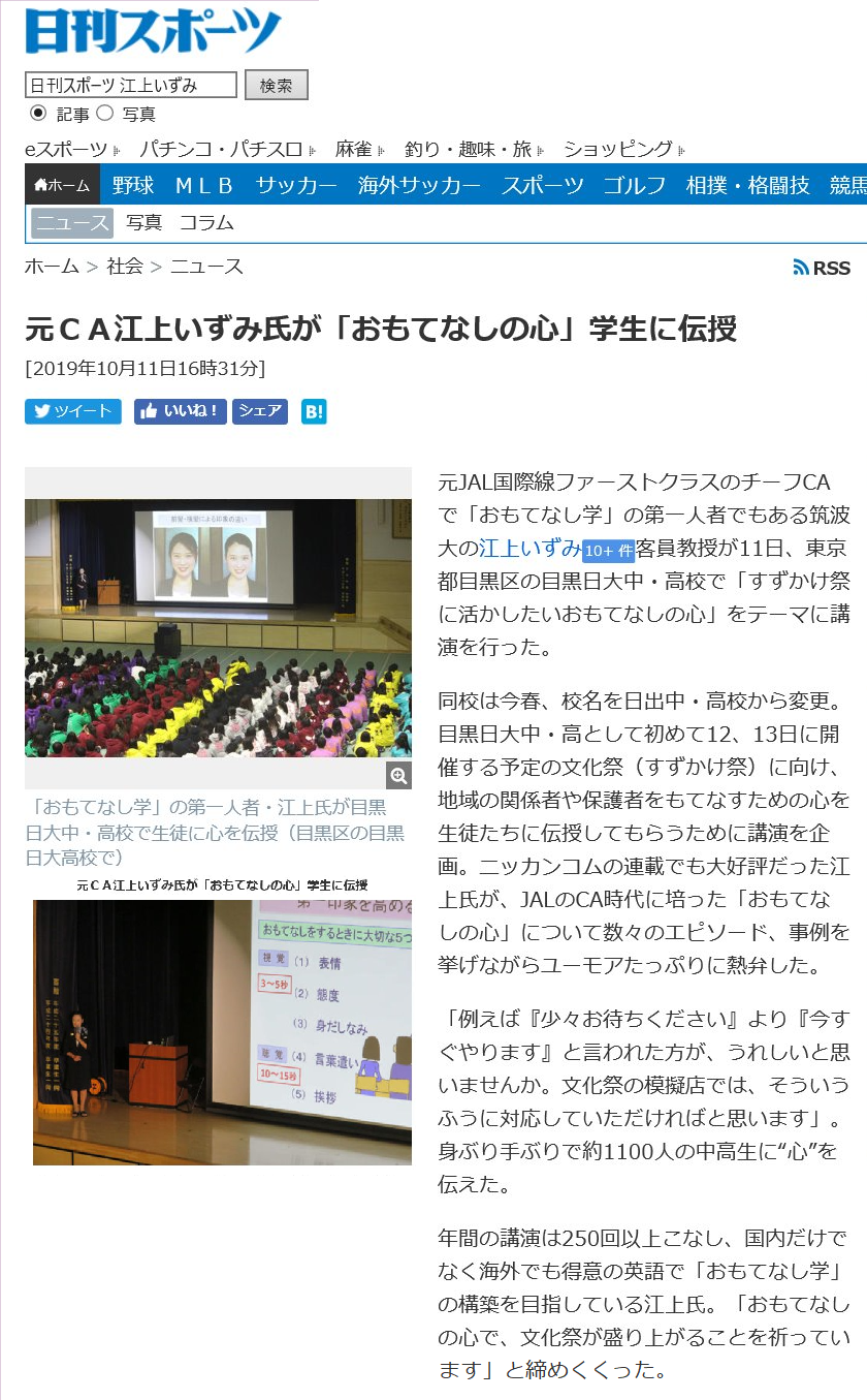2019/10/11 目黒日本大学中学・高等学校での講演の様子が日刊スポーツWebで紹介されました。スクリーンに映し出された写真は「前髪・横の髪によって同じ笑顔でも印象が変わる」ことを説いたもの。行事などでおもてなしをする時や面接時の「身だしなみ」の重要性についてお話ししているところです。
