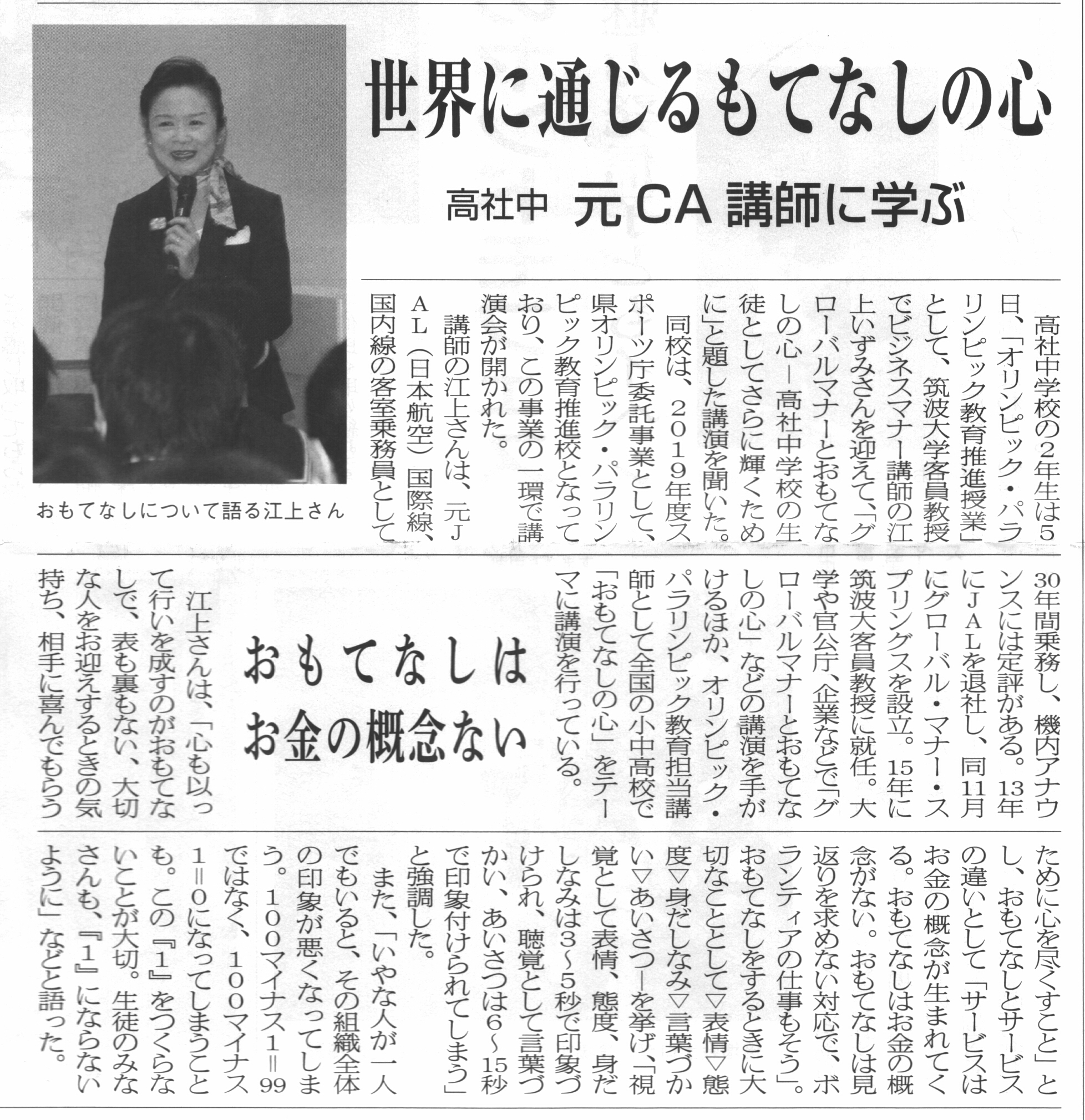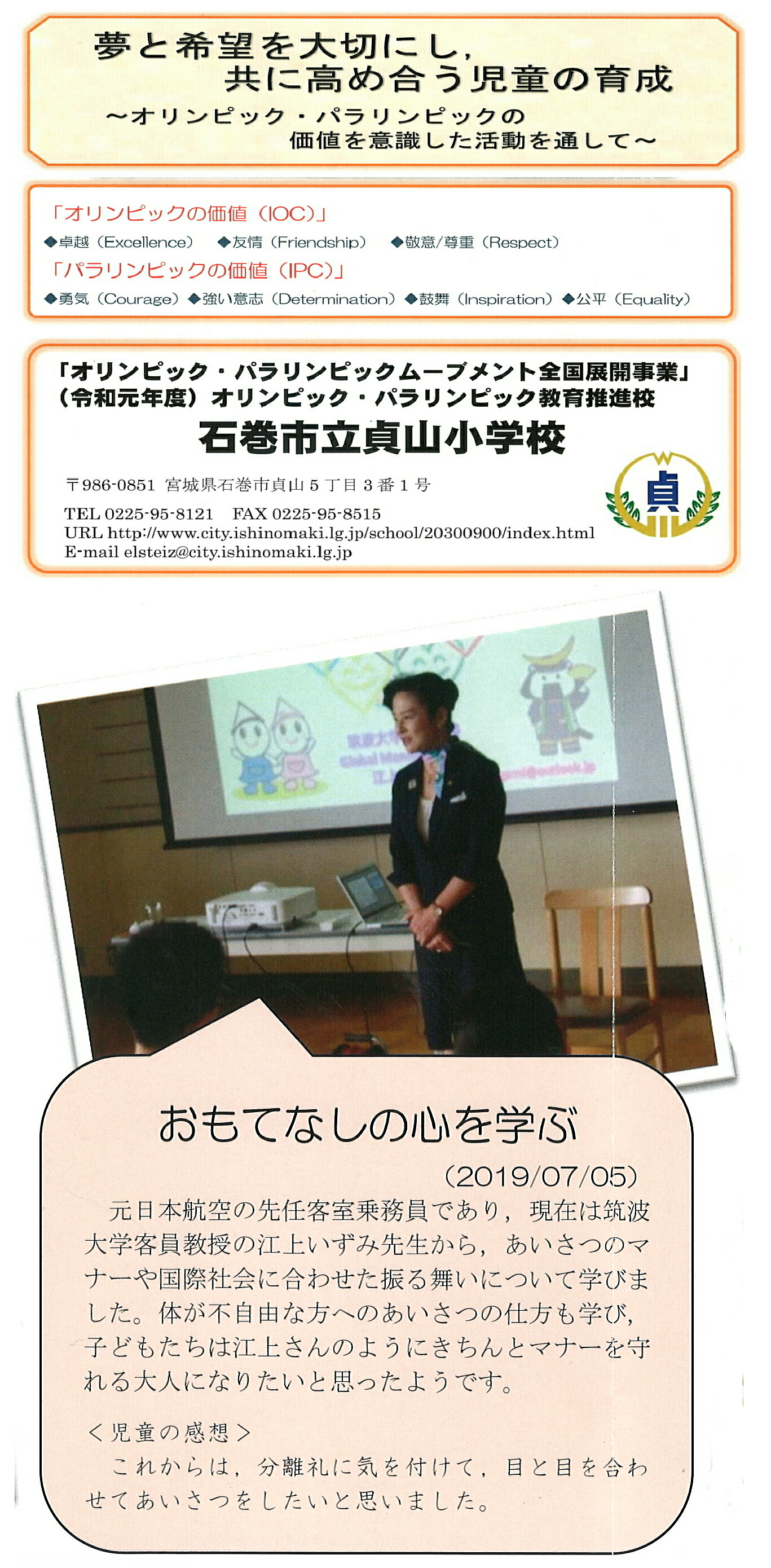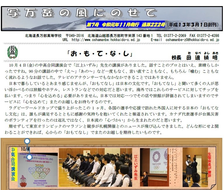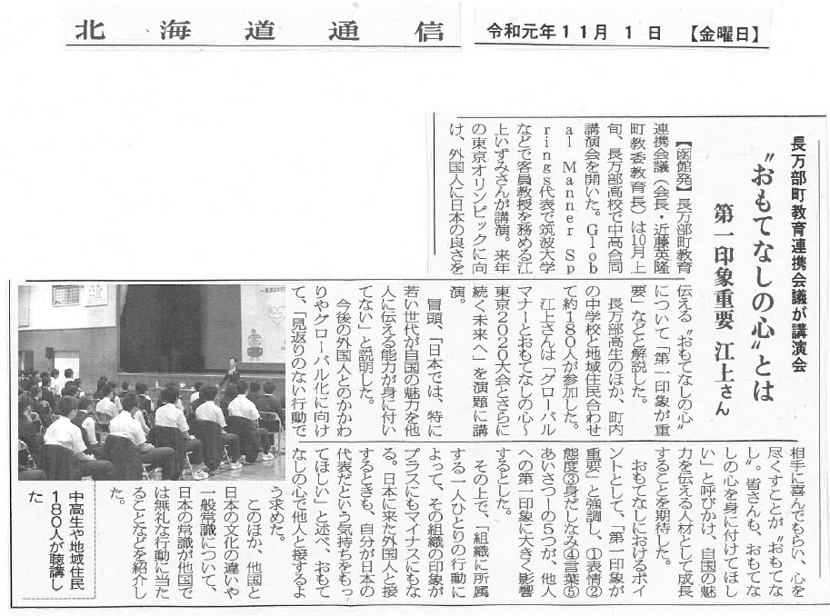 2019年10月4日(金)北海道長万部町の長万部中学校・高等学校の生徒・PTAを対象に「子ども達に伝えたいおもてなしの心」~東京2020大会とさらに続く未来へ~をタイトルに講演しました。長万部高校の学校だより11月号にその様子が掲載されました。