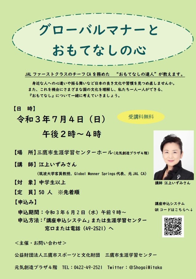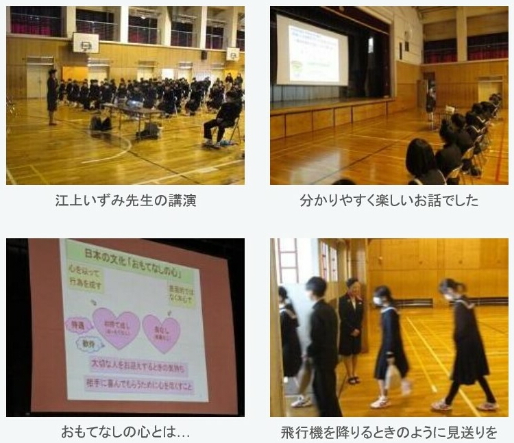 元JALの先任客室乗務員をされていた筑波大学客員教授の江上いずみ先生に来ていただき、マナー講演会を行いました。学校でお願いした演題の「社会生活に必要なマナーとおもてなしの心」に、江上先生が「~糀谷中学校の生徒としてさらに輝くために~」と素敵なサブタイトルをつけてくださいました。