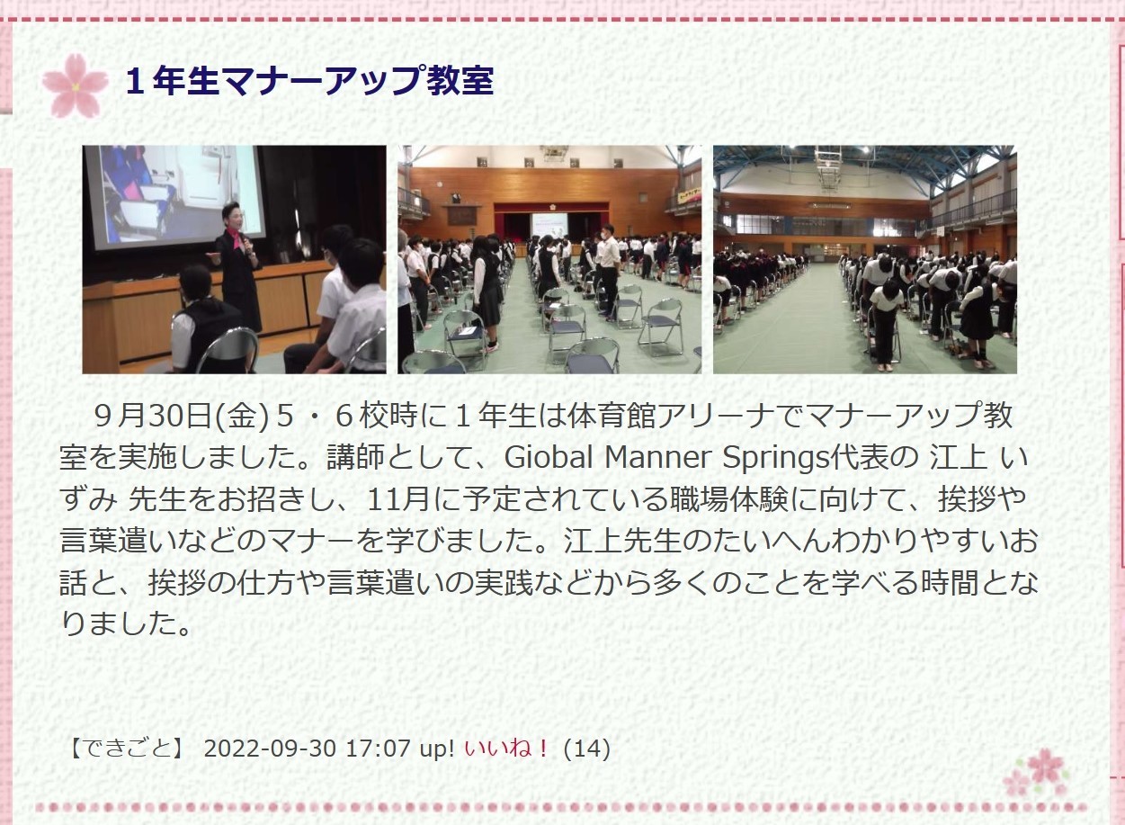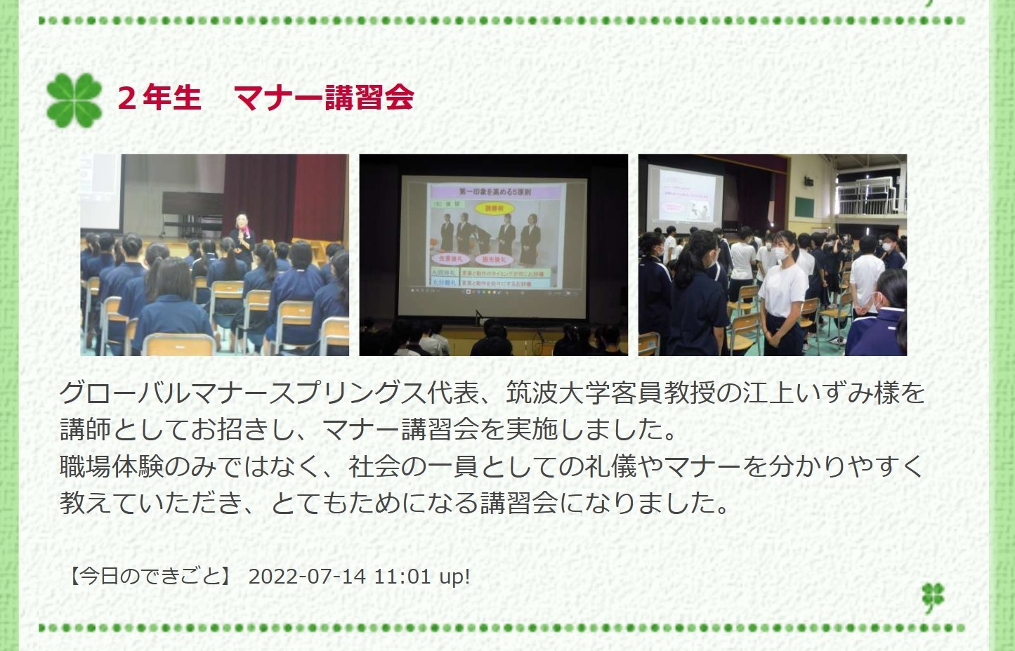 ー職場体験を目前に控えた2年生に向けてのグローバルマナー講座ー