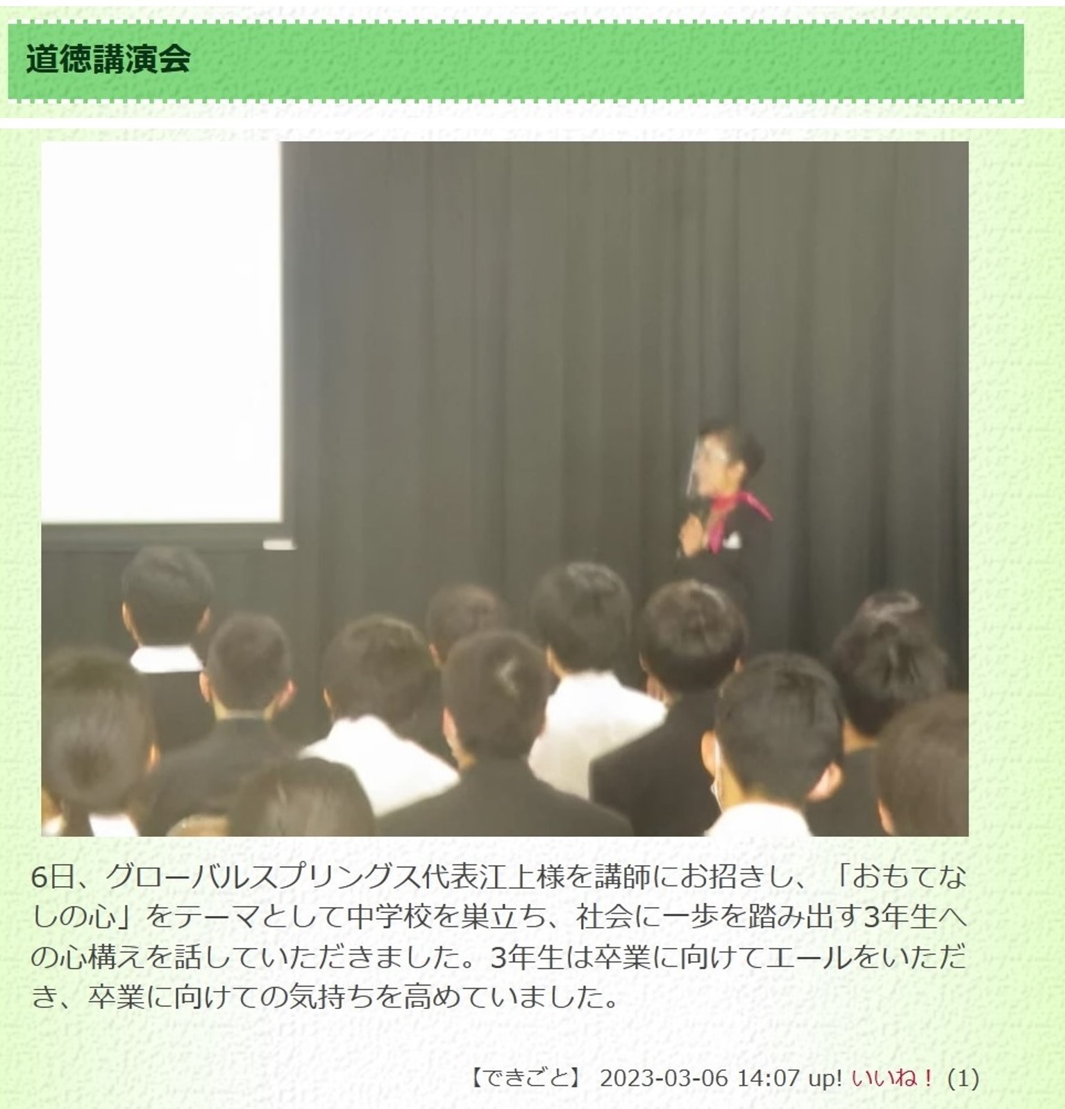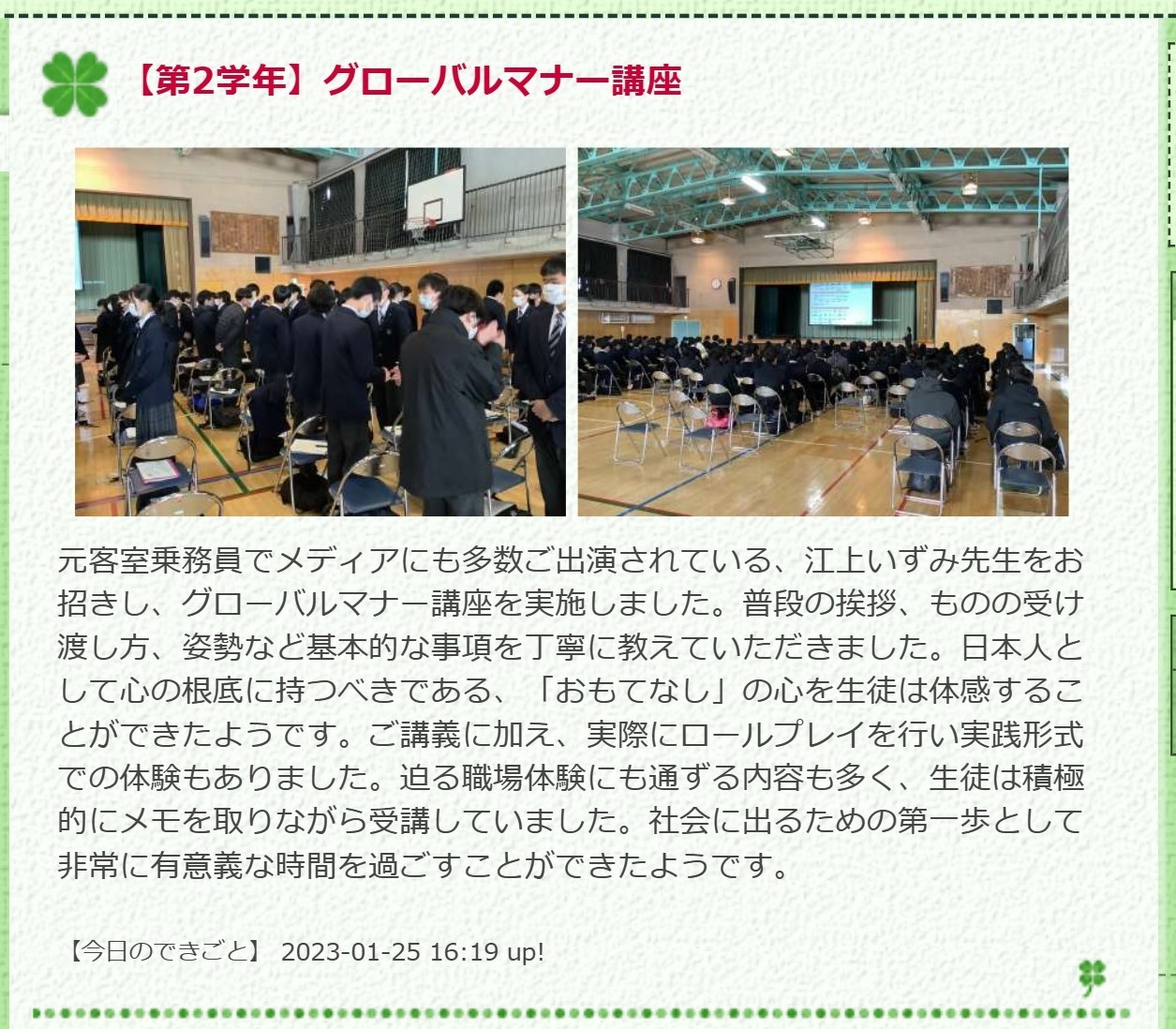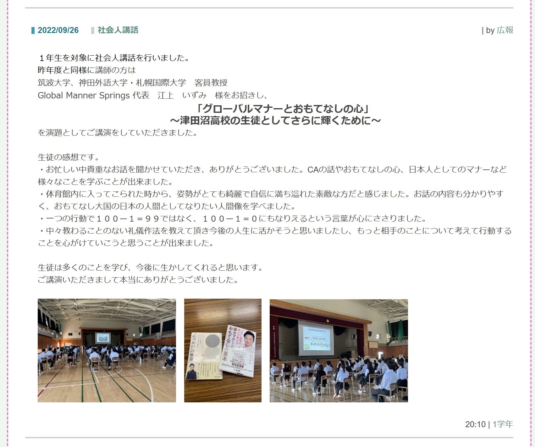 毎年「グローバルマナーとおもてなしの心」を演題に、2年生に講演しています。