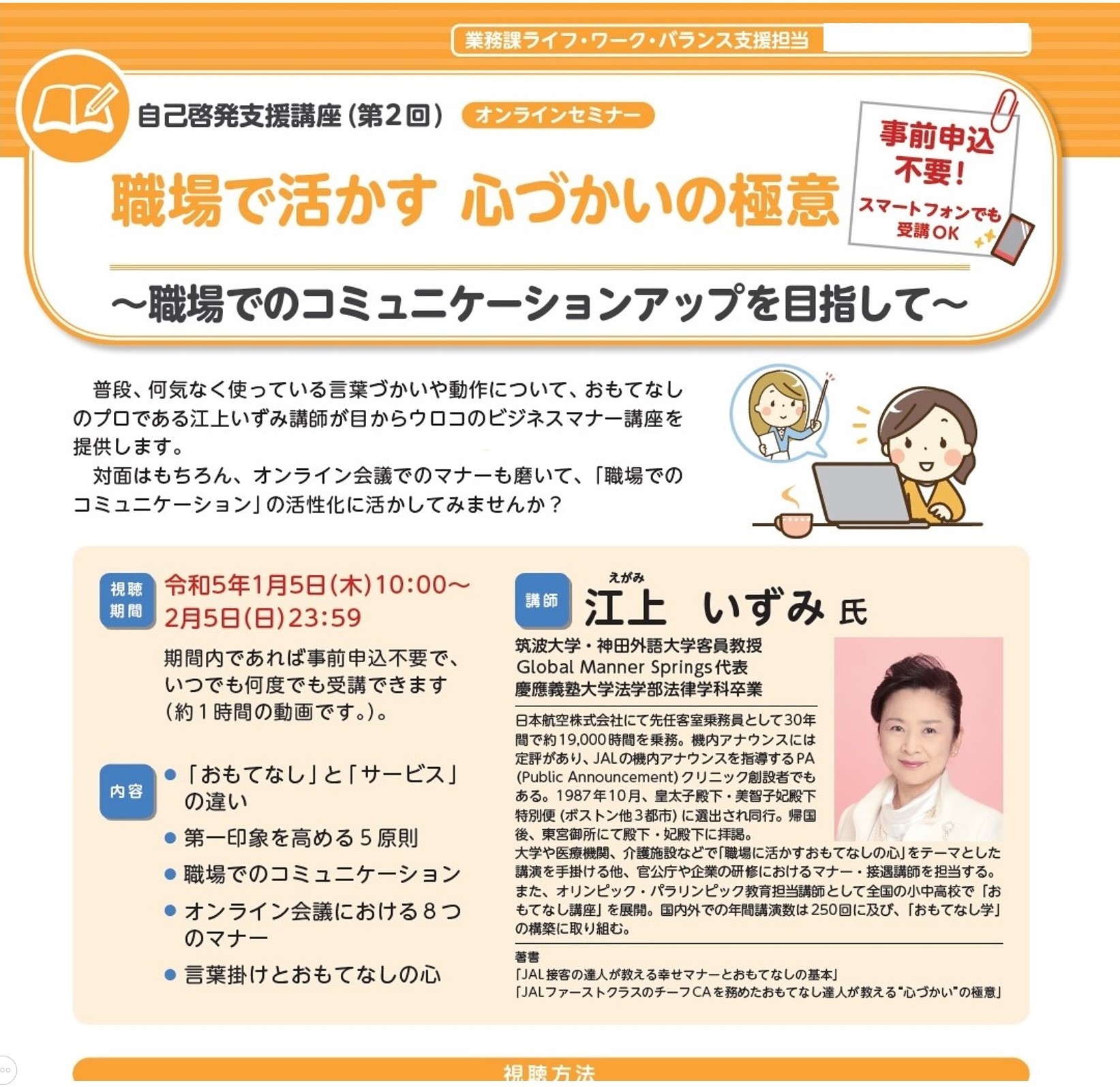都庁からのご依頼をいただき、東京都職員14万人に向けてのビジネスマナー研修オンラインセミナー講師を務めました。都庁・区市役所職員だけではなく、都内公立学校の先生方、都内病院の医師・看護師・スタッフなど多くの方にご覧いただきました。