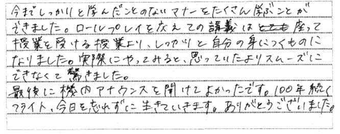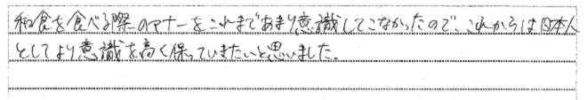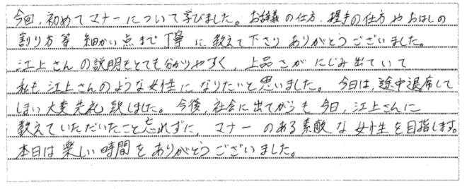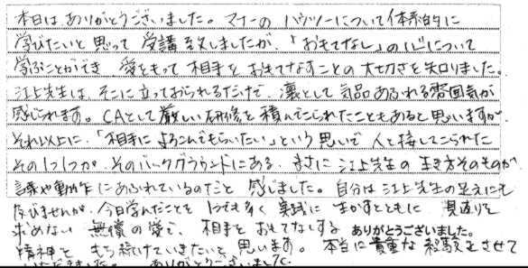 | 2014年12月18日 | K大学での講演「グローバルマナーとおもてなしの心~就活に向けて~」を聴講した学生からの声 |