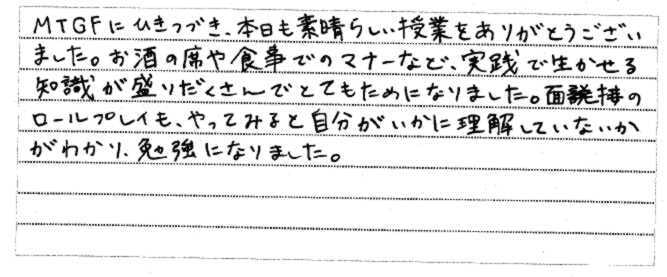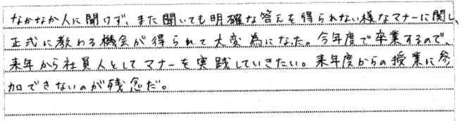 | 2014年2月27日 | T大学で行った特別セミナー「グローバルマナー」を聴講した学生の感想 |